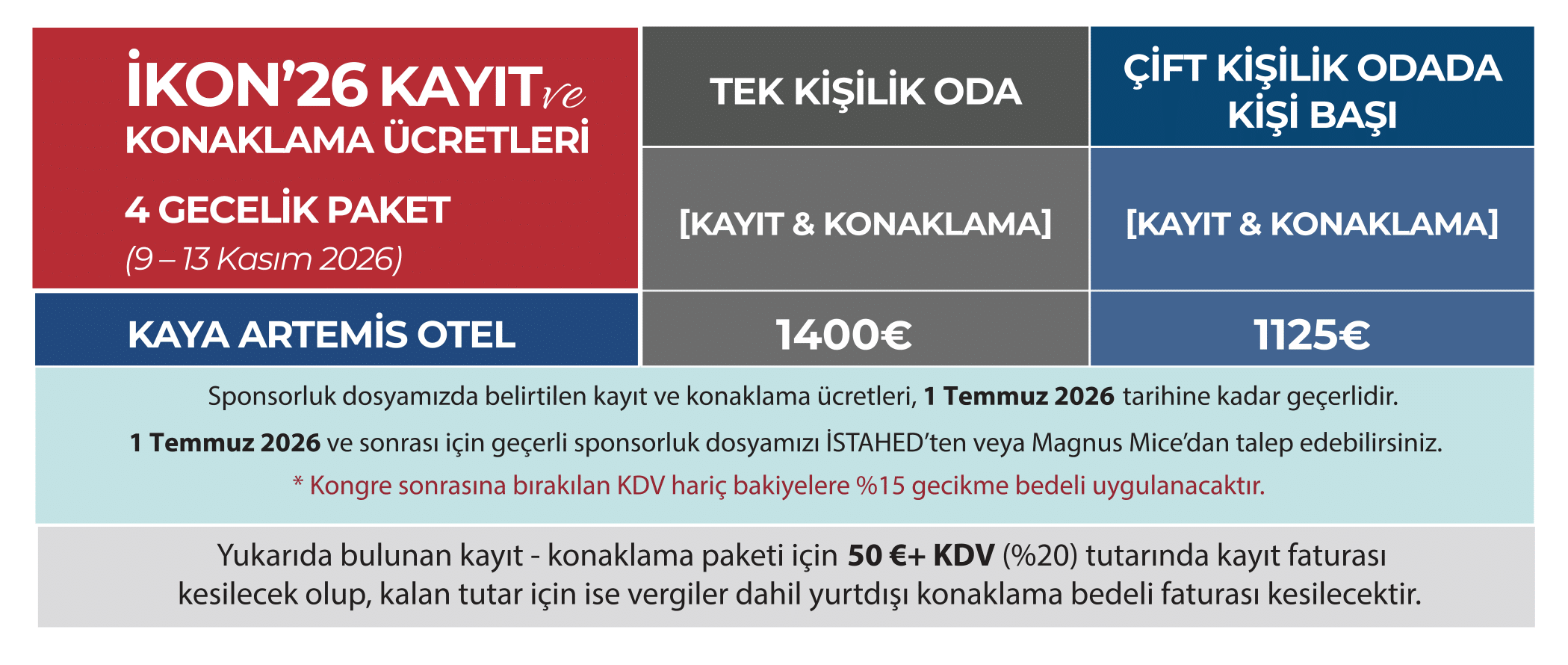 Kayıt ve konaklama ücretleri, 1 Temmuz 2026 tarihine kadar geçerlidir. 1 Temmuz 2026 ve sonrası için geçerli sponsorluk dosyamızı Magnus Mice’dan talep edebilirsiniz. Kongre sonrasına bırakılan KDV hariç bakiyelere %15 gecikme bedeli uygulanacaktır.